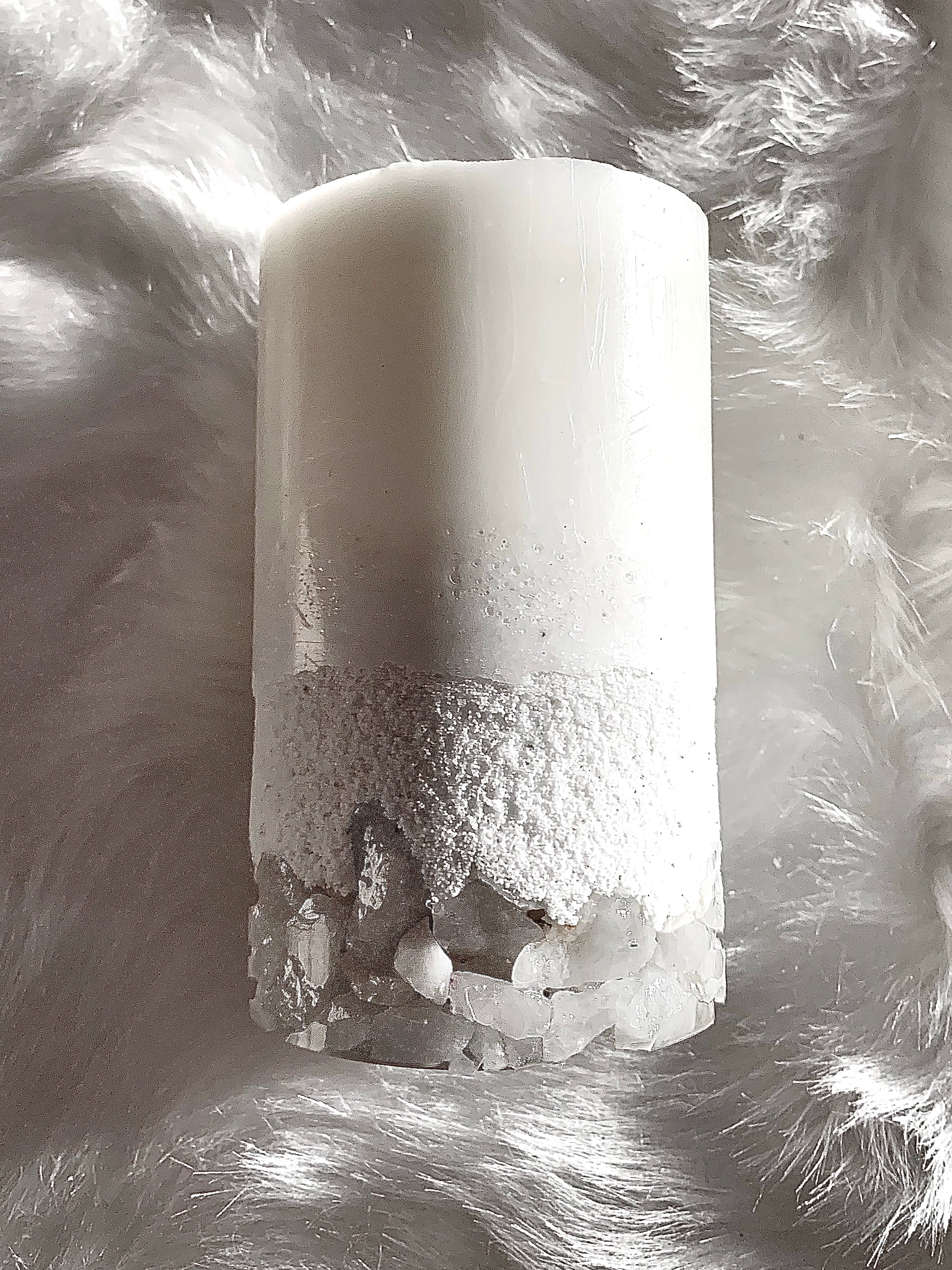 La bougie Diamond s’inspire d’une légende de diamant caché au fond d’une rivière scintillante. En ramassant et en brisant soigneusement du quartz blanc, j’ai voulu capturer cette magie.