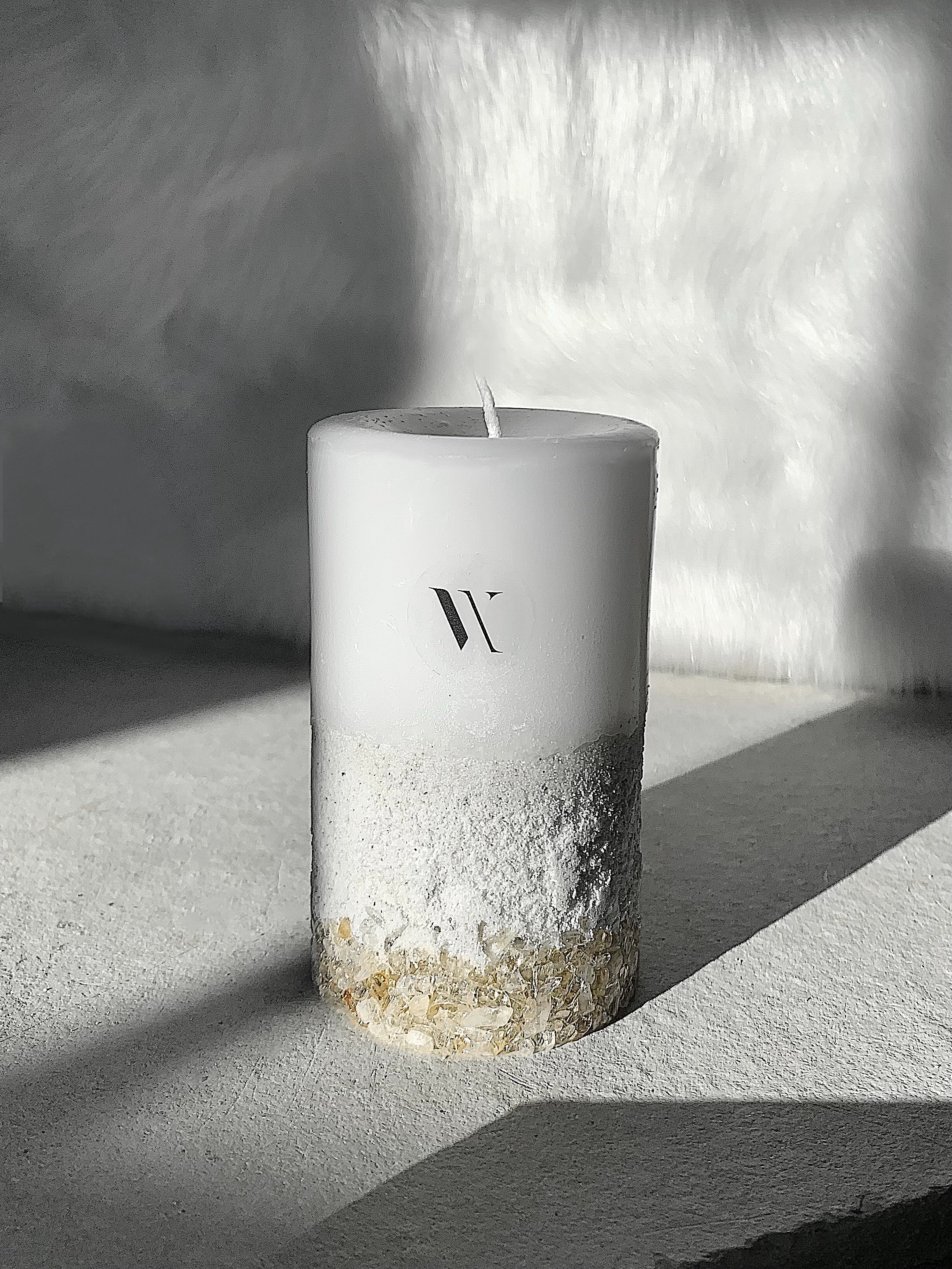 La bougie Sunrise évoque l’histoire d’un nouveau départ, inspirée par les doux rayons du soleil levant. Faite avec du sable blanc et de la citrine, elle rappelle visuellement les premières lueurs du jour, où la lumière dorée s’entrelace avec la pureté du sable.