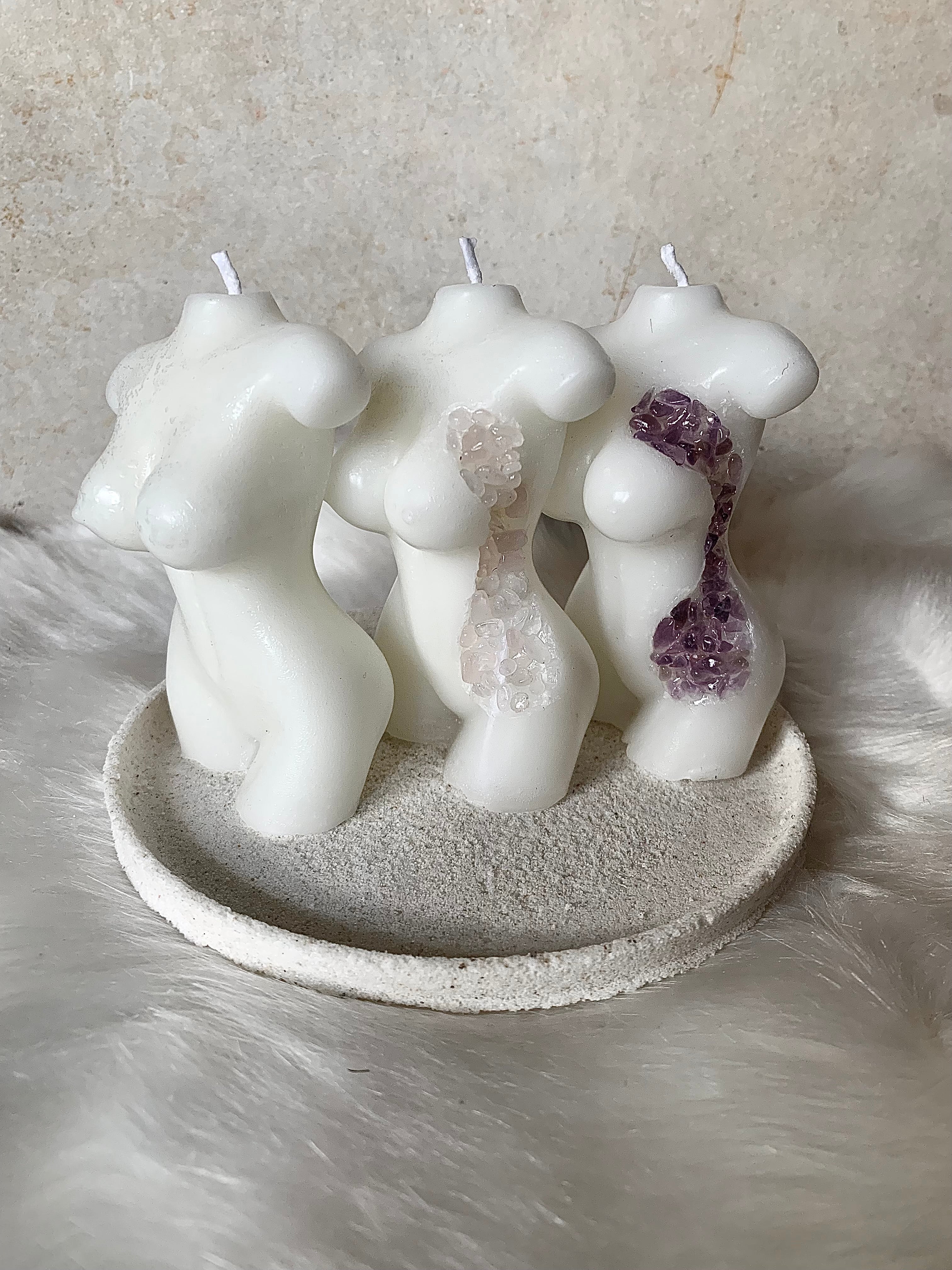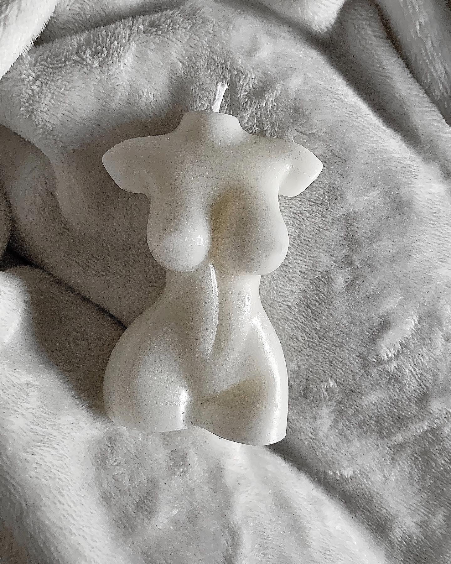 La bougie Vénus, sculptée en forme de corps féminin, incarne la beauté et la sensualité, à l’image de la déesse romaine de l’amour et de la fertilité.