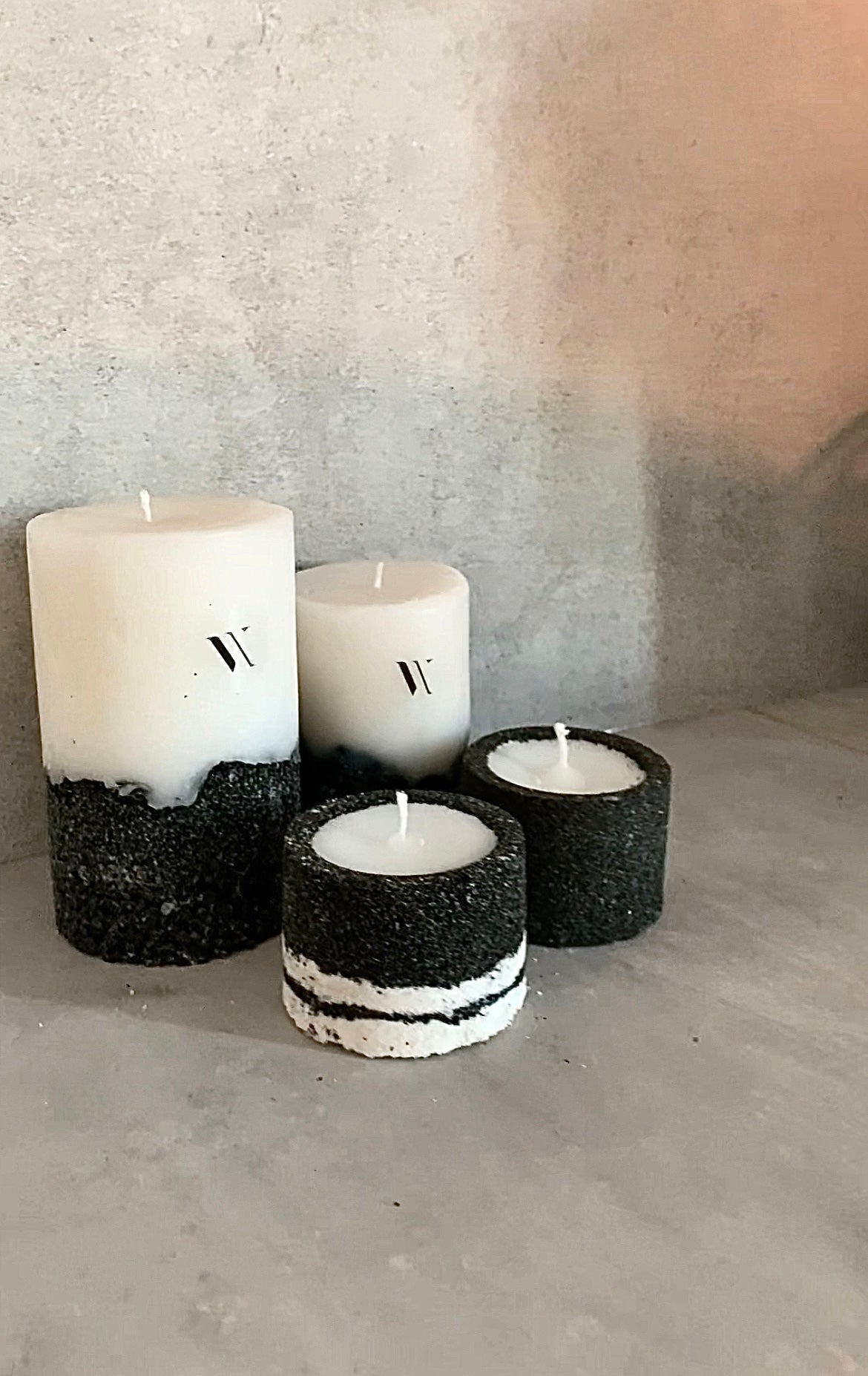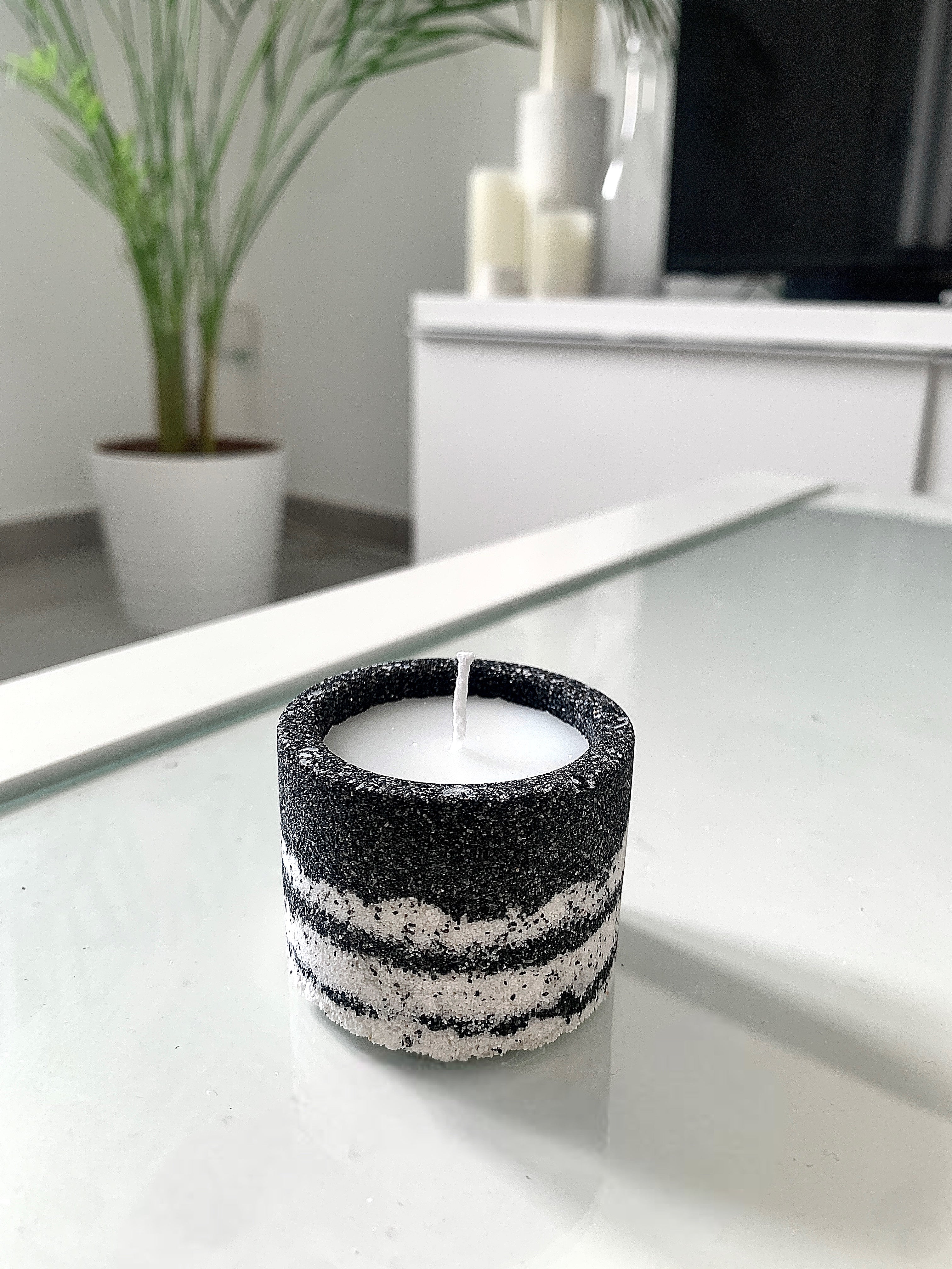 Découvrez notre petite bougie, avec son pot alliant sable blanc et noir volcanique, qui crée une harmonie élégante dans votre décoration.